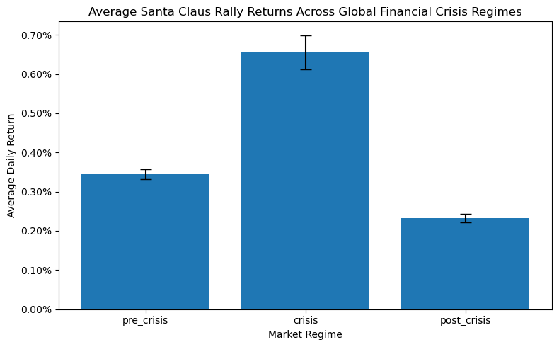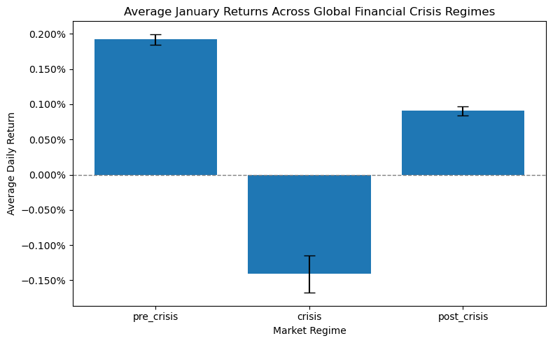 Across major market crashes and crisis periods, calendar effects do not disappear but behave differently under stress. The Holiday effect weakens during the Dot-Com bubble, where post-holiday returns often turn negative, yet it re emerges during the Global Financial Crisis with stronger gains just before holidays, showing resilience even in turbulent times. The Halloween effect becomes especially pronounced during crises. Across the Dot-Com bubble, Black Monday, and the Global Financial Crisis, winter returns remain positive while summer returns are weak or negative, making the Sell in May pattern clearer during periods of market stress. The Santa Claus Rally shows a counter cyclical behavior, strengthening sharply during the Global Financial Crisis before declining afterward, suggesting that it intensifies when market stress is highest. In contrast, the January effect experiences a clear structural break during the Global Financial Crisis. Returns turn sharply negative and only partially recover afterward, indicating a lasting disruption rather than a temporary shock.