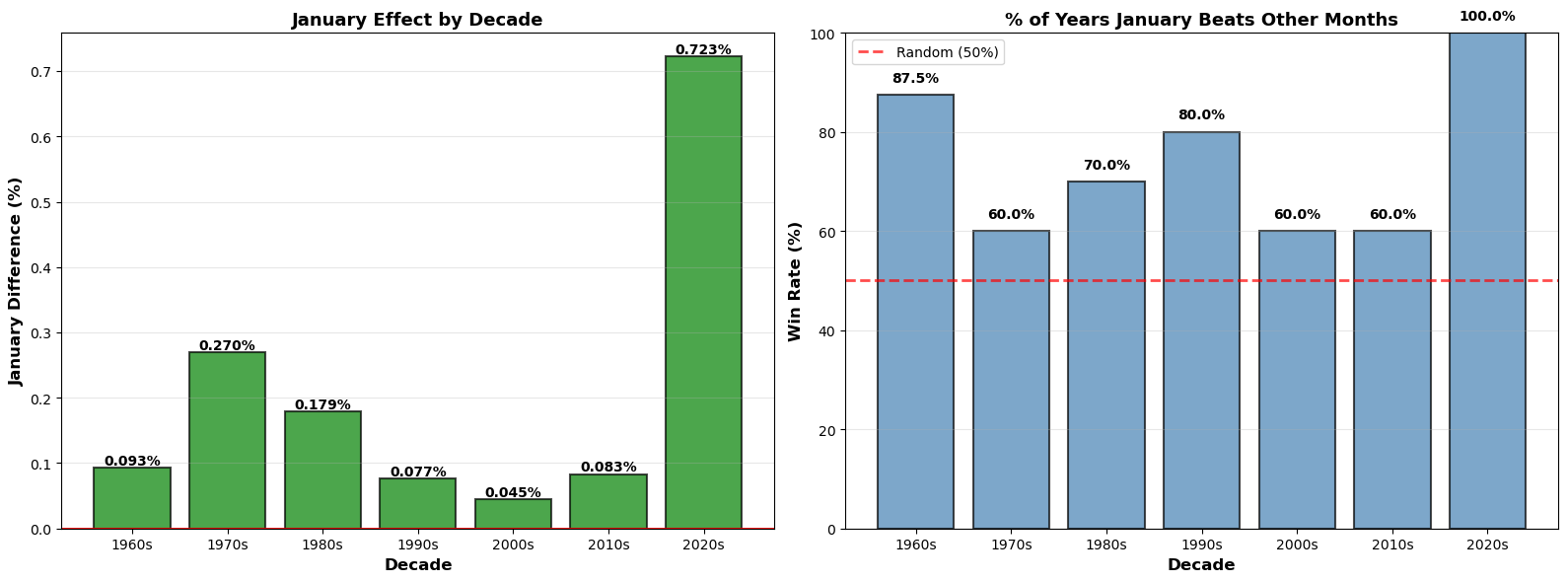 In the 2020s, we can see that we have a 100% win rate, that is because in this case we are only analysing the first 4 months in 2020. We also have to keep in mind that early January is considered pre-COVID; however rest of January, March, and April are during the peak of the pandamic so the market was unstable at that period it also justify why the returns of that year are all negative. In the first graph we basically can see the curve declining as the Januarry effect deacreses as the time passes which is mostly due to the dot com bubble and the emergence of algorithm based trading which caused the seasonaly anomoulies like January effect to decrease. The reason why graph started to go up again in 2010s is mostly due to the financial crisis at that time; however, as we discussed before the 2020s bar is a special case since it is just a 4-months analysis and not a decade like te rest. We can also see see that the win rate where January returns exceed the other month returns are higher than 50%. This shows that eventhough January is in not always exceeding the other months, there are still very high chances that it will happen.