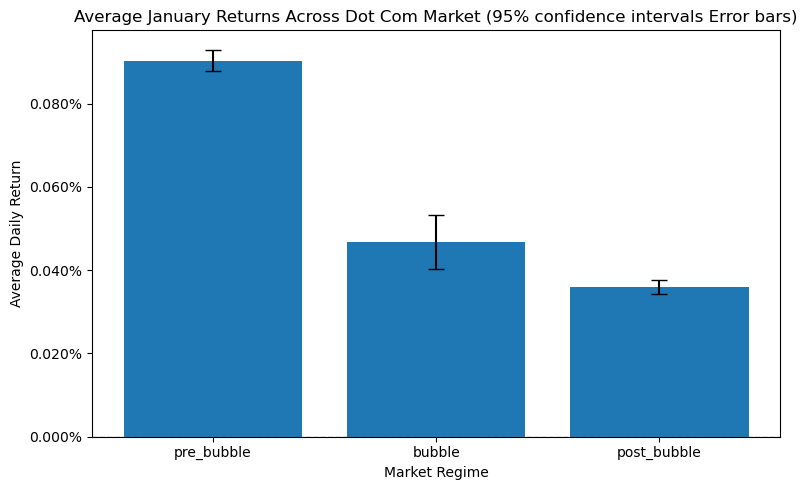 After investigating all the calendar effect’s windows using the Welch’s t-test, the detectives found an interesting lead in their story. The test rejects the null hypothesis of equal mean returns for all calendar effects, with reported p-values effectively equal to zero. This outcome reflects overwhelming statistical evidence that average returns differ between calendar and non-calendar periods; however it still doesn’t prove casuality. The investigators also had to keep i mind that, given the extremely large sample size of daily NASDAQ data, even very small mean differences become statistically detectable causing this high signifigance result. As a result, they interperet these findings as evidence of statistical significance rather than economic magnitude. The detectives decides that the presence of the highly significant p-values does not imply that calendar effects are large, stable, or economically meaningful, which motivates them to go for another independent witness as well.