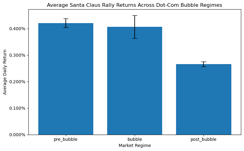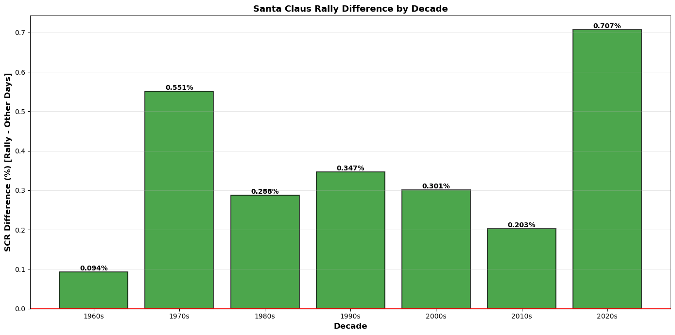 Here we can see that the santa claus rally has had a strong presence in the market since the 1970s. There is a potential decline happening starting from the 1990s; however it is still significant compared to other trading days of the week. Here as well 2020s in a specal case since it is only 4 months, an most likely it had the highest difference because of COVID related volatility and market unstability.