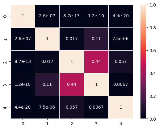 As expected, Wednesday and Thursday do not have a statistically significant difference in their averages. Other pairs of days, such as Thursday and Tuesday or Wednesday and Friday, also show no significant difference. However, Monday stands out with a statistically significant difference in its average with all the other days. Therefore, we can conclude that, except for Wednesday and Thursday, each day of the week on the Nasdaq tends to follow a distinct distribution, with Monday's average return being significantly lower than that of the other days.